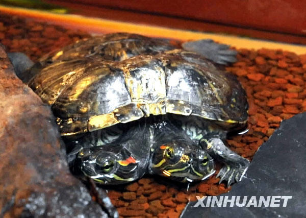 動物展中展出的雙頭龜(2009年10月15日新華社記者 黃本強 攝)。