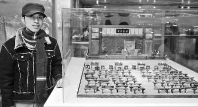 1月4日,“時光微旅”袖珍(微景觀)藝術交流特展在臺北開展,展出兩岸四地31名袖珍藝術家帶來的110件作品。圖為大陸藝術家西樹與他創作的電影《霸王別姬》微景觀戲臺合影。
