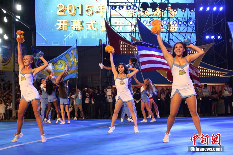 9月12日晚,上海淮海路流光溢彩,第26屆上海旅游節拉開帷幕。來自19個國家和地區的23輛花車和31支表演方隊,圍繞著“海上絲路”這一主題,全方位地展示“一帶一路”沿線城市和地區的風采。圖為美國加州大學洛杉磯分校(UCLA)啦啦隊表演隊亮相。 張亨偉 攝