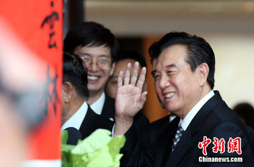 2月26日,海協會會長陳云林率經貿考察團來到臺灣農業大縣云林縣參訪,當地農會巧妙打出“云林歡迎陳云林”等條幅。圖為陳云林在云林科技大學聽取農產品登陸等相關介紹前,向記者揮手致意。中新社記者 董會峰 攝