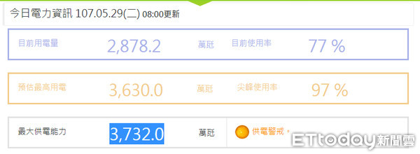 根據(jù)臺(tái)電網(wǎng)站顯示,昨天用電數(shù)據(jù),尖峰用電出現(xiàn)在下午1點(diǎn)41分,最高用電量達(dá)3600.65萬千瓦,創(chuàng)今年用電第1高,也創(chuàng)下歷史5月用電第1高紀(jì)錄。今日實(shí)際備轉(zhuǎn)容量129.1萬千瓦、實(shí)際備轉(zhuǎn)率3.59%,持續(xù)亮出供電警戒的橘燈。
