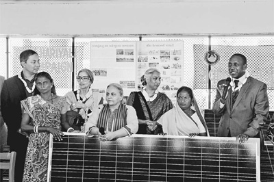 日前,在印度古吉拉特邦第一大城市艾哈邁達(dá)巴德,聯(lián)合國秘書長特別代表云蓋拉(右一)將太陽能板贈送給印度自主就業(yè)婦女協(xié)會。人民視覺