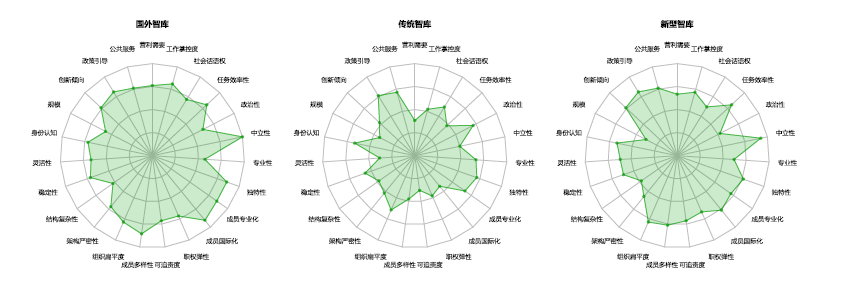 現(xiàn)代智庫20世紀40年代出現(xiàn),70年代后在國外形成行業(yè),90年代后被視為公共事務決策中的重要一環(huán)。同時期中國的資政機構(gòu)則經(jīng)歷了完全不同的發(fā)展軌跡。先是政府機關有專職的研究部門,后來又組建了政府機關之外專司研究的機構(gòu),同時教育機構(gòu)也兼有研究職能。這三類機構(gòu)在公共決策中都起到了重要作用且貢獻良多。但為什么學者和專家反而將國外智庫當成標桿?這個問題頗為復雜,簡單粗暴地講主要原因是:智庫這個行業(yè)突然受到普遍關注,專家學者們在對比扮演智庫角色的中國機構(gòu)與國外智庫時發(fā)現(xiàn),國外智庫具有一些中國的類似機構(gòu)所不具有的優(yōu)勢。特別是國外智庫中的佼佼者的表現(xiàn)令人嘆為觀止。事實上,很多學者專家口中的國外智庫指的只是諸如蘭德公司、卡耐基國際和平基金會、布魯斯金學會這樣的業(yè)中翹楚。我們有一個研究針對智庫的組織內(nèi)涵。研究方法是先從文獻中找出多種組織特征,這些特征會偏向咨詢研究類機構(gòu),但這個條件不是必須的,只要是組織的特征即可。我們共找出23個組織特征,并讓專家分別給他心目中的國外智庫、中國傳統(tǒng)智庫和中國新型智庫打分,評分結(jié)果如下圖所示。從組織特征輪廓上來看,中國新型智庫與國外智庫非常接近,與中國傳統(tǒng)智庫差別很大,而且中國新型智庫在所有組織特征上的得分都要高于中國傳統(tǒng)智庫。