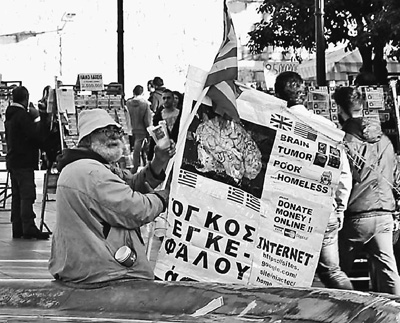 自債務危機爆發以來,希臘承諾實施以減薪、增稅、裁員和私有化為主要內容的緊縮和改革政策。一系列的緊縮措施使民眾生活受到嚴重影響,約1/4的家庭陷入貧困。圖為今年1月希臘大選期間,在雅典市中心國會大廈前廣場乞討的老人。