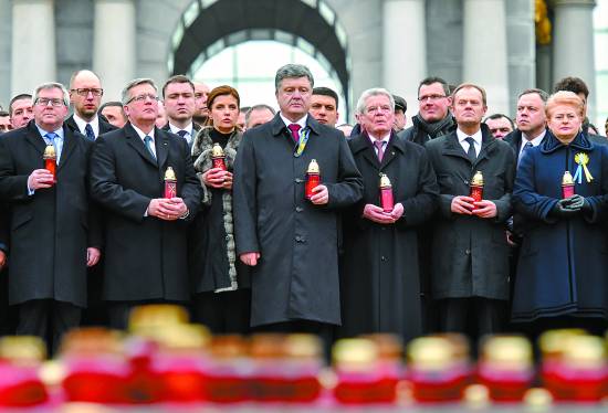 2月22日,烏克蘭首都基輔,烏克蘭總統波羅申科、波蘭總統莫羅夫斯基、德國總統高克等參加“尊嚴游行”,紀念烏政權更迭一周年。CFP供圖
