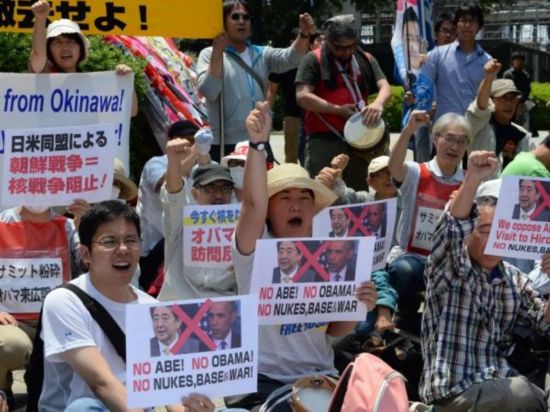 2016年5月27日,在日本廣島原子彈爆炸遺址前,市民在針對奧巴馬訪問的抗議活動中呼喊口號。新華社記者馬平攝