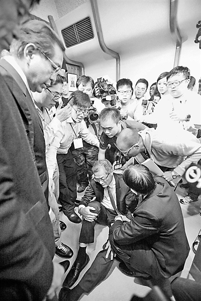 盧寵茂跌倒,一眾學(xué)生仍不肯讓路。擾攘了十多分鐘,才把盧寵茂送離會(huì)議室,再轉(zhuǎn)到瑪麗醫(yī)院治理。圖片來(lái)源:香港媒體