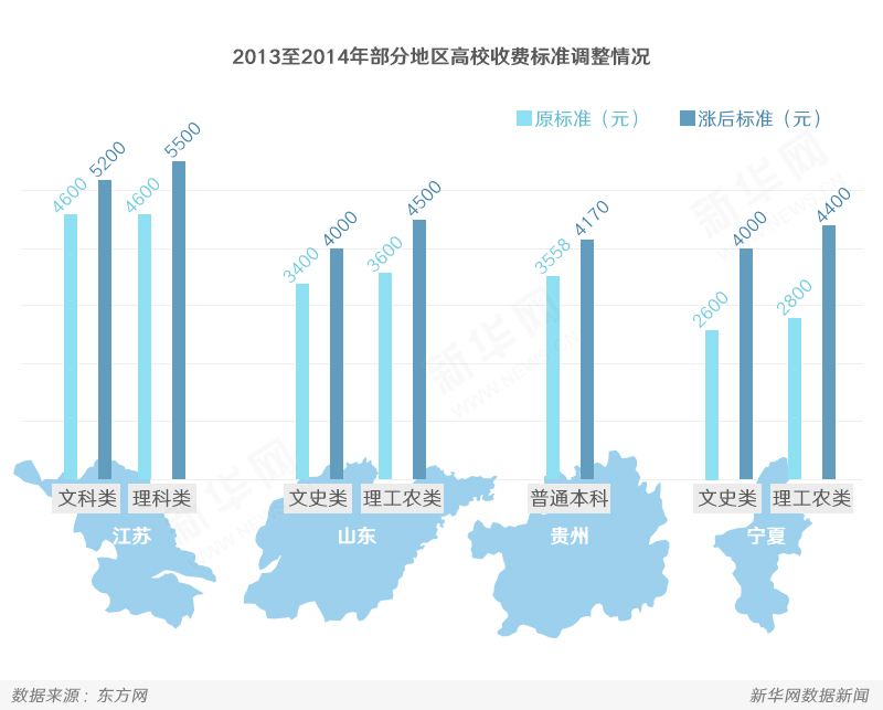 2013至2014年,天津、江蘇、福建、山東、湖北、湖南、廣西、貴州、寧夏、浙江、江西、廣東等地調(diào)整普通高校收費(fèi)標(biāo)準(zhǔn);