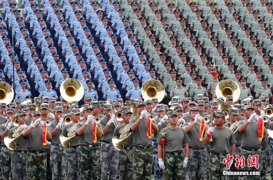 解放軍聯(lián)合軍樂(lè)團(tuán)團(tuán)長(zhǎng)鄒銳日前透露,聯(lián)合軍樂(lè)團(tuán)將在9月3日閱兵當(dāng)天第一個(gè)進(jìn)入閱兵場(chǎng)地,為紀(jì)念大會(huì)和閱兵提供“背景音樂(lè)”。聯(lián)合軍樂(lè)團(tuán)由來(lái)自全軍55支專業(yè)、業(yè)余軍樂(lè)團(tuán)(隊(duì))的1000多名成員組成,擔(dān)負(fù)紀(jì)念大會(huì)開始全部合唱伴奏和閱兵全過(guò)程的音樂(lè)演奏任務(wù)。解放軍聯(lián)合軍樂(lè)團(tuán)訓(xùn)練場(chǎng)景。