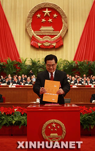 3月15日,十一屆全國人大一次會議在北京人民大會堂舉行第五次全體會議,選舉第十一屆全國人民代表大會常務委員會委員長、副委員長、秘書長;選舉第十一屆全國人民代表大會常務委員會委員;選舉中華人民共和國主席、副主席;選舉中華人民共和國中央軍事委員會主席。這是胡錦濤在投票。 新華社記者鞠鵬攝