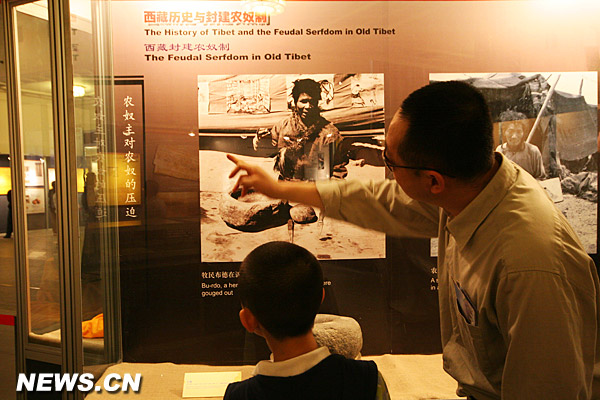 任嘉牧小朋友聽大伯跟他講西藏那過去的事。 由中國國家民族事務委員會等聯合主辦的《西藏今昔大型主題展》于4月30日在北京開展。展覽內容分為西藏歷史與封建農奴制度和日新月異的新西藏兩個部分,以160件實物和400余張圖片向參觀者展示舊西藏的落后與黑暗,新西藏的發展與進步。展覽將持續至7月25日,并免費向公眾開放。新華網 文濤 攝