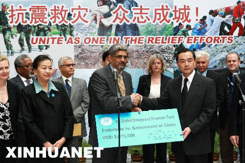 新華網北京5月21日電(記者 榮燕 孫奕) 21日下午,中國外交部副部長王毅在北京代表中國政府接受了聯合國向四川地震災區捐贈的800萬美元緊急人道主義援助。