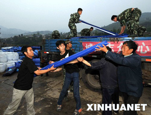 5月20日,工作人員在搬運救災帳篷。當日,首批聯合國捐贈的320頂帳篷運抵四川汶川水磨鎮。 新華社記者 高潔 攝
