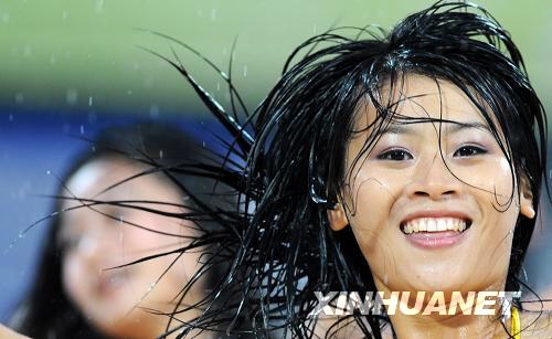 8月21日,沙灘寶貝比賽間隙在雨中激情表演。當日,北京奧運會沙灘排球女子冠軍爭奪戰和3-4名決賽在朝陽公園沙灘排球場舉行。新華社記者格桑達瓦攝