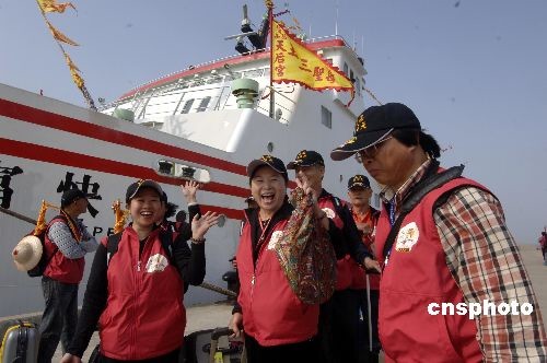 2月13日,搭載著428名臺灣媽祖信眾的“合富輪”緩緩抵達“媽祖故鄉”湄洲島的3000噸級對臺客運碼頭。這是2008年底海峽兩岸簽訂“兩岸海運協議”后的第一個兩岸海上客運直航活動,也是湄洲島口岸繼與金門、馬祖實現海上客運通航后的又一突破。圖為臺灣媽祖信眾抵達后非常興奮。 中新社發 王東明 攝