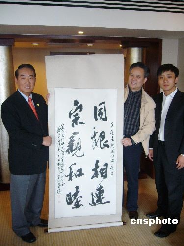 四月六日,親民黨主席宋楚瑜在河南鄭州會見著名書法家、河南省嵩陽書畫院院長宋衛國。宋衛國向宋楚瑜贈送《同根相連 宗親和睦》的字幅。 中新社發 王中舉 攝