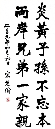 新華網河南頻道6月18日訊  鄭州日報報道:昨日,鄭州黃河風景名勝區收到一份寄自寶島臺灣的珍貴“禮物”——親民黨主席宋楚瑜先生親筆手書的“炎黃子孫不忘本 兩岸兄弟一家親”。14個遒勁有力的大字,蘊含著祖國寶島炎黃子孫認祖歸宗的強烈情感。
