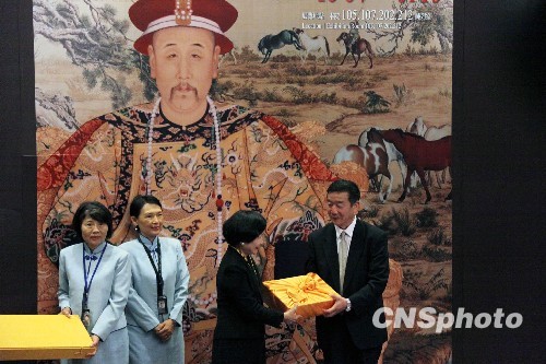 10月6日,北京故宮博物院院長鄭欣淼向臺北故宮博物院致贈《清乾隆朝清文大藏經》,臺北故宮院長周功鑫回贈《清康熙朝藏文龍藏經》。兩岸故宮60年來首度合辦的展覽“雍正——清世宗文物大展”,7日在臺北故宮博物院開展,這是兩岸故宮開啟“務實交流”后,交出的首張亮眼的成績單。 中新社發 黃少華 攝