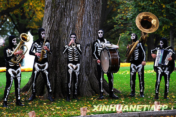 10月31日萬圣節前夜,打扮成骷髏摸樣的樂手在美國白宮外演奏。當天,美國總統奧巴馬與妻子米歇爾在白宮與孩子們共度萬圣節。新華社/法新