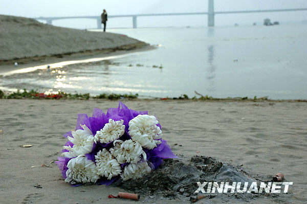 10月26日,江灘邊擺放的鮮花寄托著人們對年輕英雄的懷念。24日,面對落入湍急江水的少年,長江大學(xué)14名大學(xué)生不顧自身安危,紛紛跳入水中救人。手挽手組成的“人梯”,挽救了兩名孩童如花的生命,而陳及時、何東旭、方招3名大學(xué)生,卻獻出了年僅19歲的生命。