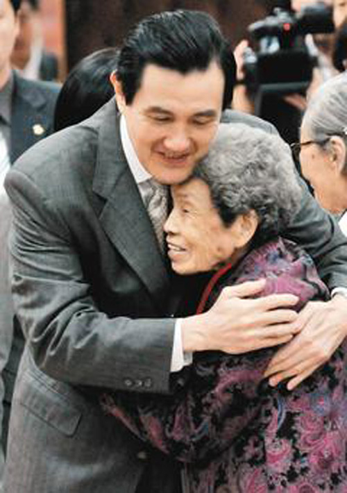 馬英九與慰安婦阿嬤鄭陳桃相互擁抱。舊圖。(網絡圖)