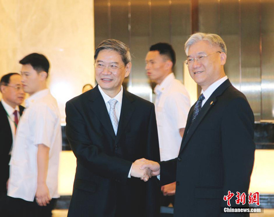 資料圖:5月23日,國務(wù)院臺(tái)辦主任張志軍(左)在金門,與臺(tái)灣方面陸委會(huì)主委夏立言(右)舉行會(huì)面。圖為張志軍抵達(dá)會(huì)場(chǎng)時(shí),與夏立言握手致意并交談。黃少華 攝