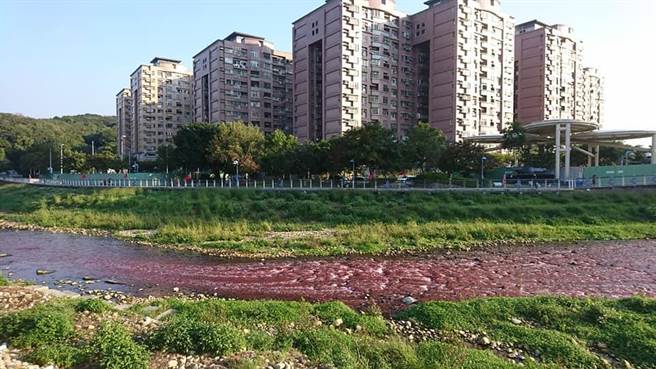 南崁溪被民眾拍下染成紅褐色的畫面。(圖片來源:臺(tái)灣“中時(shí)電子報(bào)”)