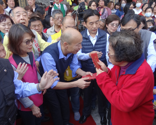 韓國(guó)瑜這幾天忙著到高雄各區(qū)發(fā)春節(jié)紅包,所到之處受到大批民眾歡迎。(圖片來(lái)源:臺(tái)灣《聯(lián)合報(bào)》)