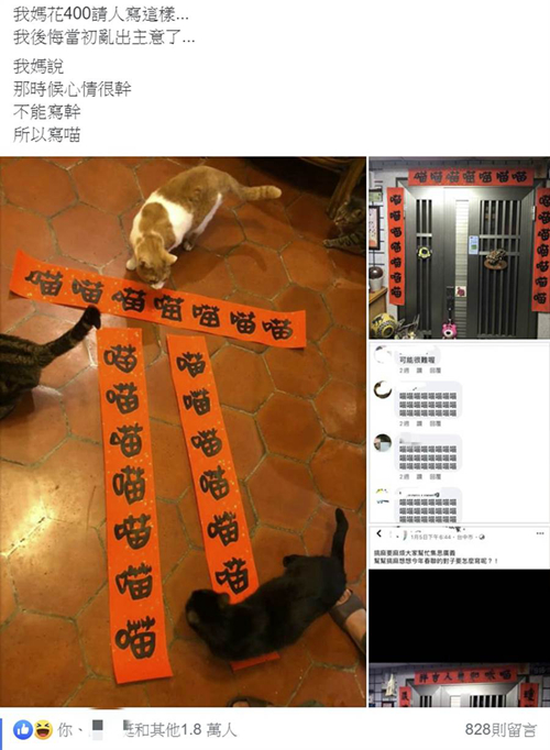 兒子崩潰發(fā)文說(shuō),媽媽花了400元新臺(tái)幣請(qǐng)人寫(xiě)春聯(lián),寫(xiě)了三幅全都是“喵喵喵喵喵喵喵”。(圖片取自臺(tái)媒)