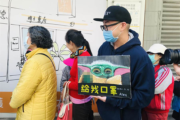 中國臺灣網2月6日訊 據臺灣“中時電子報”報道,臺當局推行的口罩實名限購措施6日起實施,許多民眾一早便持健保卡排隊購買。有排隊民眾自行繪制影視作品《星球大戰》中“尤達大師”的形象暗諷蔡英文,并在畫作上寫著“給我口罩!”暗嗆臺當局。