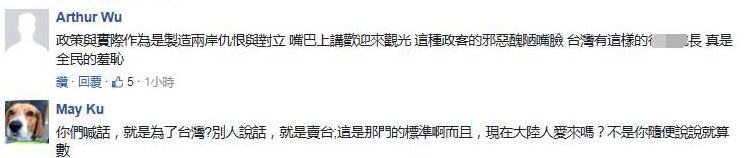 網友也直言,大陸游客赴臺并不是因為島上的觀光資源與設備,“完全是沖著同文同種,兩岸一家親”、“人家是沖著寶島和同胞才來的”、“先承認‘九二共識’吧”、“為了選票又再騙”!
