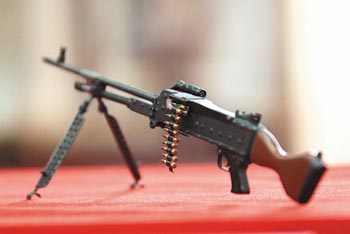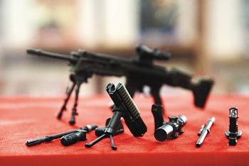 中國(guó)臺(tái)灣網(wǎng)6月16日消息 據(jù)臺(tái)灣《聯(lián)合晚報(bào)》報(bào)道,臺(tái)軍陸軍官校管理科學(xué)系四年級(jí)學(xué)生郭晉愷無(wú)師自通,用紙張為原料,做出縮小比例,唯妙唯肖的槍支模型。在他的迷你軍火庫(kù)中有50多種槍支,都是靠著一把刀、一張紙、瞬間接著劑做出來(lái)的,比起日本模型公司出品的槍支模型毫不遜色,陸軍官校還為他舉行個(gè)展。