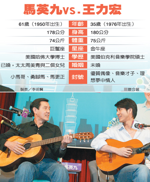 馬英九、王力宏兩位“師奶殺手”將在臺灣清華大學(xué)校慶對談,有網(wǎng)友建議合唱《龍的傳人》。圖為2007年兩人在“兩世代偶像對談”會(huì)上合彈吉他共唱英文歌曲。 (圖片來源:臺灣《聯(lián)合報(bào)》)