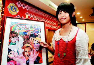 據(jù)臺灣《聯(lián)合報(bào)》報(bào)道,臺中市五權(quán)初中三年級學(xué)生陳郁旻,參加2009到2010年度聯(lián)合國和國際獅子會合辦的國際和平海報(bào)創(chuàng)作比賽,擊敗35萬名參賽者,勇得世界第一。