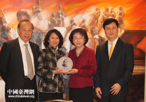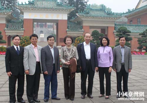 中山市副市長韓澤生(右二)、中山市政府副秘書長鄭向榮(左一)、中山市臺務(wù)局局長黃全歡(右一)等陪同林澄枝女士、謝孟雄先生等參觀中山紀念中學(xué)時合影(圖片來源:中山市臺辦)