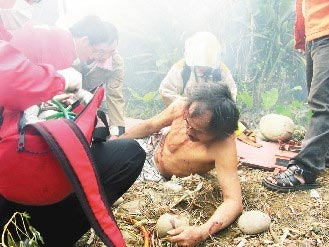 一名傷者滿臉鮮血,赤裸著上身,在現場哀嚎,救難人員正準備將他抬上擔架送醫。《聯合報》記者段鴻裕攝