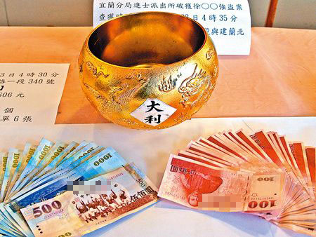 臺灣怪匪托缽搶劫,所托的缽是金色、塑料制,表面貼有“大吉”、“大利”、“招財進寶”等吉祥字樣。 來源:臺灣《中國時報》