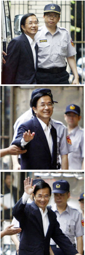陳水扁(中)等人涉及的公務(wù)機(jī)要費(fèi)等弊案上午進(jìn)行二審宣判,陳水扁步下囚車出庭時(shí)神情愉悅。圖片來源:臺(tái)灣《聯(lián)合報(bào)》
