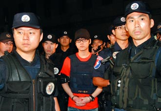 臺(tái)中市警局昨晚把槍殺翁奇楠的主嫌廖國(guó)豪(中穿紅衣防彈背心者),移送少年法庭收容。(圖片來(lái)源:臺(tái)灣《聯(lián)合報(bào)》)