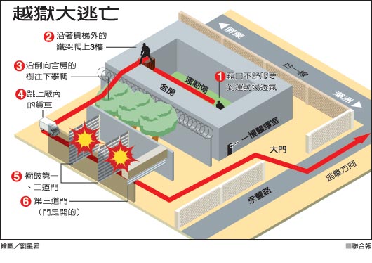 通緝犯越獄示意圖。(圖片來(lái)源:臺(tái)灣《聯(lián)合報(bào)》)