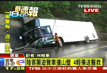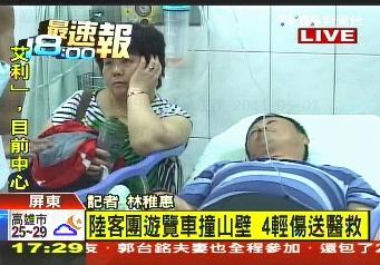 根據(jù)屏東警方調(diào)查,此一大陸旅行團來自上海,今日下午前往臺東時,在上述路段發(fā)生擦撞山壁的車禍,車禍發(fā)生原因,正由警方調(diào)查中。