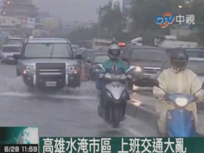 受到西南風(fēng)和午后熱對(duì)流影響,臺(tái)灣南部地區(qū)從昨天(27日)晚間開始降下大雨,雨從凌晨一直下到今天上午,造成高雄市區(qū)多處道路淹水,有些地區(qū)水深及膝,甚至達(dá)到半個(gè)輪胎高。