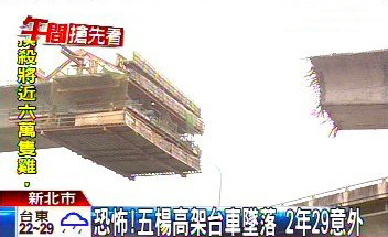 中國臺灣網3月4日消息 據臺灣TVBS電視臺報道,臺灣五楊高架橋昨天晚間發生工程安全意外,一輛重達百噸的工程臺車,從10米高的地方摔落高速路,現場鐵條、碎片散落一地,一度造成交通阻塞,幸好當時橋下的工作人員已經撤離,才沒造成人員傷亡,這也是五楊高架工程開工以來第29次意外。