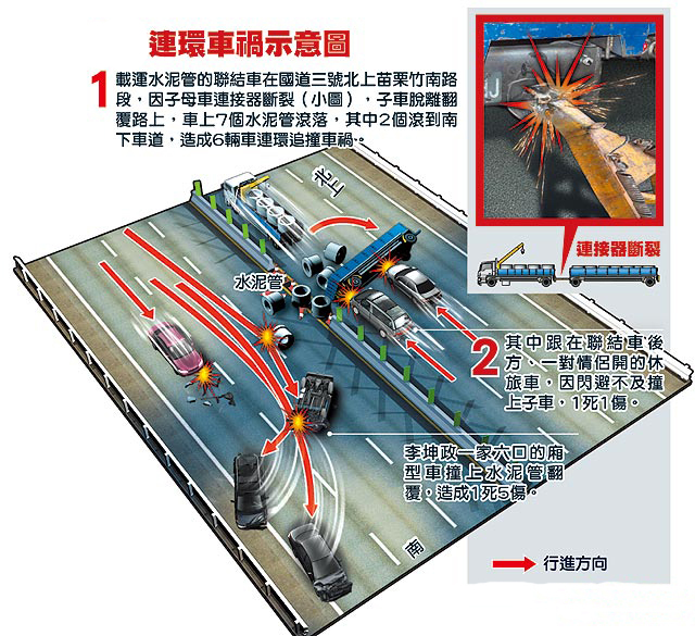 中國臺灣網2月23日消息 據臺灣媒體報道,臺灣昨日發生一起破壞力有如電影《絕命終結站》翻版的車禍,一輛載運巨形水泥管的聯接車昨日清晨在一處公路行駛,途中疑因子母車連接器平日保養維護不當而斷裂,子車脫離后翻覆于公路上,車體橫在路面,車上7個水泥管2個滾到路面另一側車道,導致南北雙向共6車受撞擊,連環受損,釀成2死6輕重傷的悲劇。