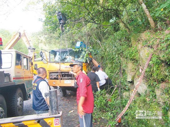 據(jù)報道,失事的是臺灣電力公司重達21噸的外包工程車,車輛剎車失靈后,在重力加速度下猛烈撞擊山壁,使得輪胎陷入排水溝,動彈不得,車頭嚴重變形,司機陳炳鑫被卡在司機座上,他的2名同事則僅受輕傷。
