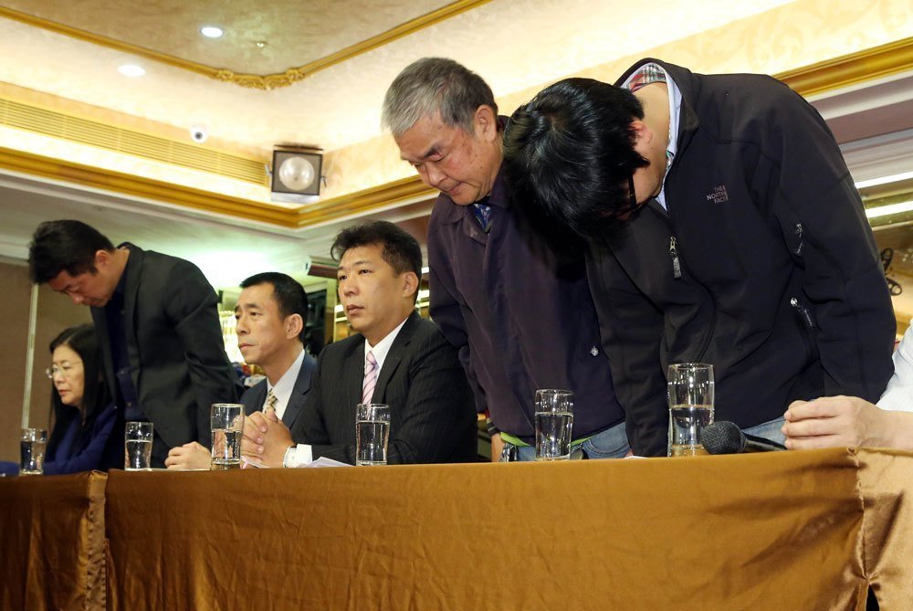 蝶戀花創辦人周比蒼(右二)及負責人周繼弘(右一)父子17日上午首度公開露面道歉,針對康姓司機是否疲勞駕駛,周繼弘一度說出“人為財死、鳥為食亡”,引發在場家屬眾怒。(圖片來源:“聯合新聞網”)