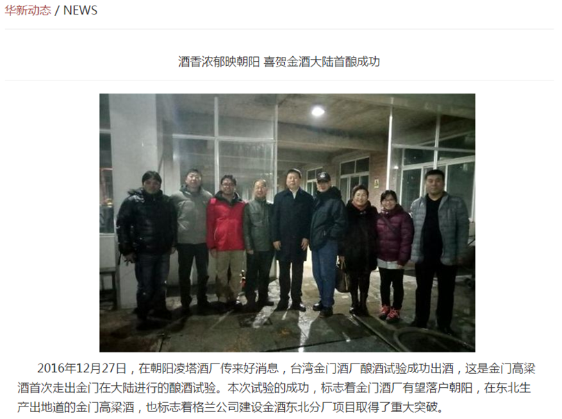 注意,這是一張講述去年12月27日“舊事”的圖片,取自遼寧朝陽一家名為華新建設集團的企業網站。該消息稿稱,金門高粱酒首次走出金門在大陸進行了釀酒試驗并取得成功,標志著金門高粱酒廠有望落戶朝陽,在東北生產出地道的金門高粱酒。