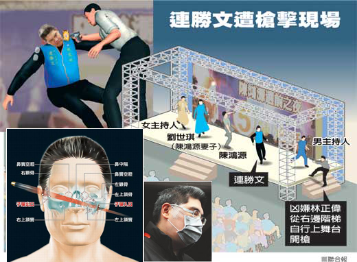 11月26日晚8時(shí)17分,國民黨榮譽(yù)主席連戰(zhàn)之子連勝文在為國民黨籍新北市市議員候選人陳鴻源站臺(tái)助講時(shí),林正偉持槍沖上臺(tái),架住連勝文的脖子朝臉部開了一槍,子彈從連的左臉頰貫穿,右臉頰射出,現(xiàn)場工作人員火速?zèng)_上臺(tái),流彈還射中臺(tái)下一位小兒麻痹殘障人士黃運(yùn)圣。連勝文被送往臺(tái)大醫(yī)院急救,幸無生命危險(xiǎn)。黃運(yùn)圣送醫(yī)急救后,仍傷重不治身亡。 【詳細(xì)】