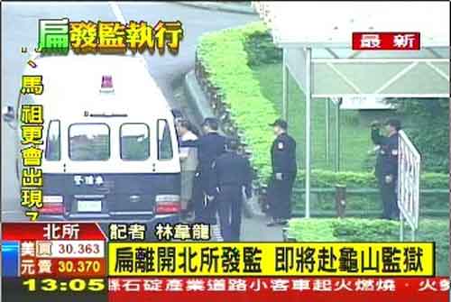 12月2日下午1時37分左右,陳水扁囚車在警方車隊戒護下抵達(dá)臺北監(jiān)獄,入監(jiān)服刑。【詳細(xì)】