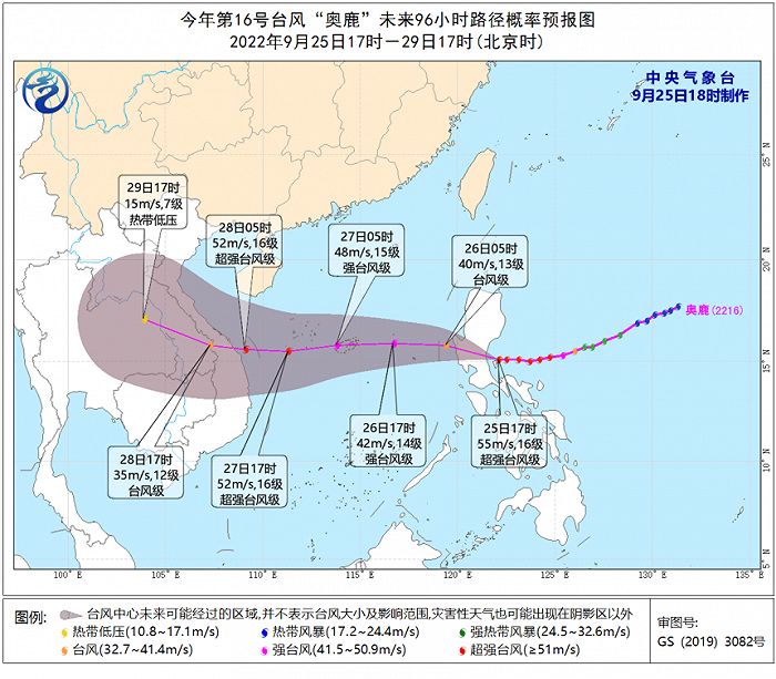 預(yù)計,“奧鹿”將以每小時25公里左右的速度向西偏北方向移動,將于今天晚上在菲律賓呂宋島東部沿海登陸(48~55米/秒,15~16級,強臺風(fēng)級或超強臺風(fēng)級),今天夜間穿過呂宋島,強度有所減弱,26日早晨到上午進入南海中東部海域,之后向偏西方向移動,逐漸向越南東部沿海靠近,強度還將有所加強,28日早晨到上午在越南東部沿海登陸(48~52米/秒,15~16級,強臺風(fēng)級或超強臺風(fēng)級),登陸后強度快速減弱。中央氣象臺9月25日上午發(fā)布臺風(fēng)藍色預(yù)警。